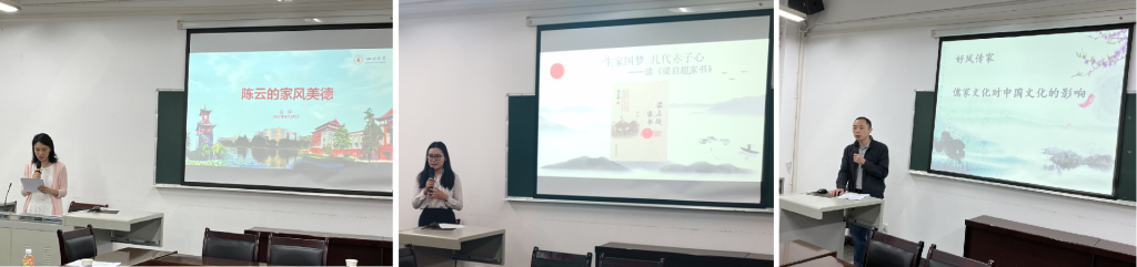 4月29日上午,望江东区党支部汪萍老师、望江西区党支部熊薇老师、华西校区党支部廖远老师在“好风传家——读书分享会”上先后分享了《陈云的家风美德》、《梁启超家书》、《儒家文化对中国文化的影响》,畅谈良好家风对个人、家庭和社会的重要意义。