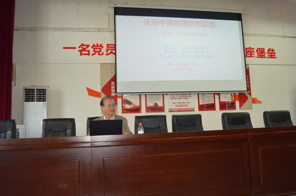为宣传法治中国的理论精髓与核心要义,推进法治中国建设,4月12日下午,学校银龄宣讲团成员李平教授应邀为四川建筑职业技术学院经济管理系师生作题为《法治中国的理论和实践——学习二十大报告专题讲座》的辅导报告。讲座中,李平教授以“是什么”“为什么”和“怎么做”为逻辑,根据党的二十大报告、《中共中央关于全面推进依法治国若干重大问题的决定》《法治中国建设规划2020-2025》,分别阐述了法治中国的含义、意义及建设举措。阐释了法治中国是全面推进依法治国的奋斗目标,全面依法治国是国家治理的一场深刻革命,法治具有固根本、稳预期、利长远的基本功能。法治中国的总目标是建设中国特色社会主义法治体系,建设社会主义法治国家。建设法治中国符合历史规律、执政规律、改革规律、发展规律。在全面建设社会主义现代化国家征程上,我们必须把全面依法治国摆在全局性、战略性、基础性、保障性位置,向着建设法治中国这一奋斗目标不断努力。最后,李平教授结合自己近期参与的“法律明白人”师资培训工作,谈了体会:法治中国建设,顶层设计很重要,实践更需要从基层做起。