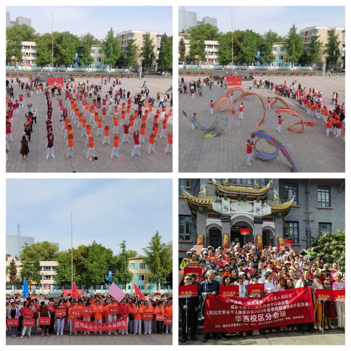 4月30日上午,春光明媚,万里无云。“科学运动*健康成都*百万老人动起来”成都市第十二届全民健身运动会暨122cc太阳集成游戏老年人体育协会2025年春季校园绿道健步走活动启动仪式分别在望江校区体育广场和华西钟桂楼竹园举行。老年体协成员近600余名老同志参加。望江校区启动仪式由老体协主席卢生元主持,华西校区启动仪式由老体协副主席刘建学主持。